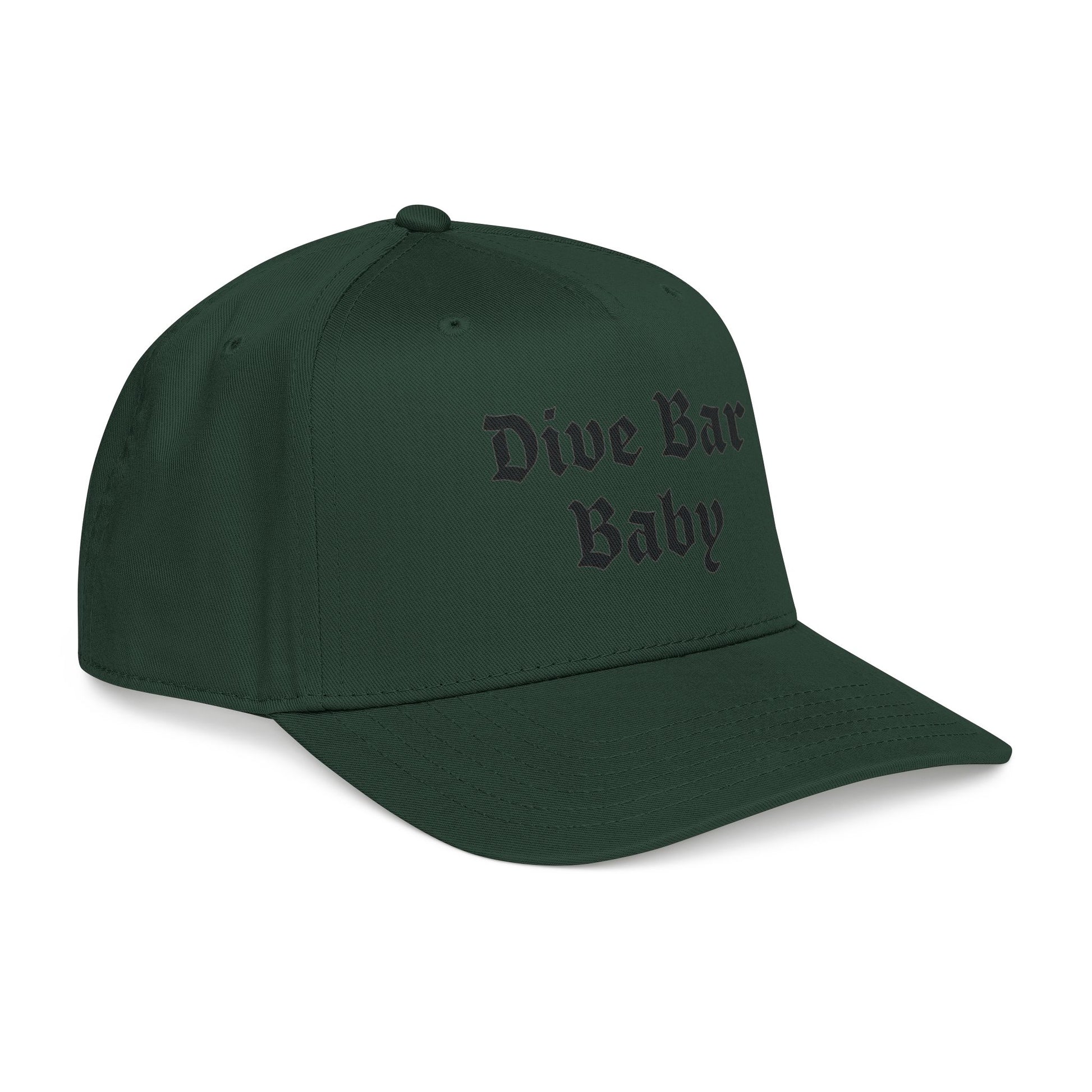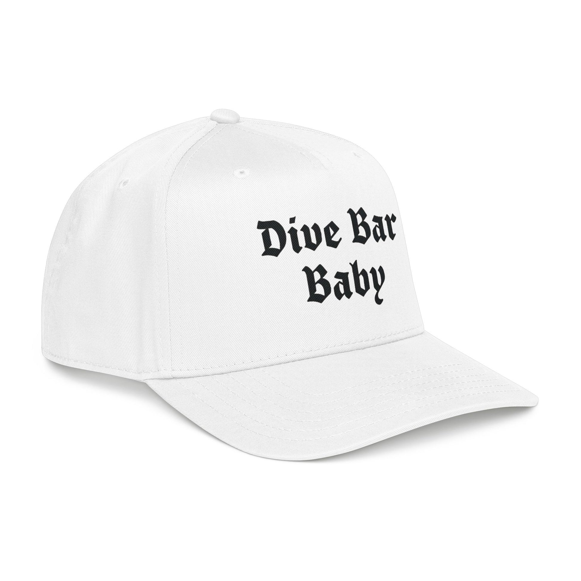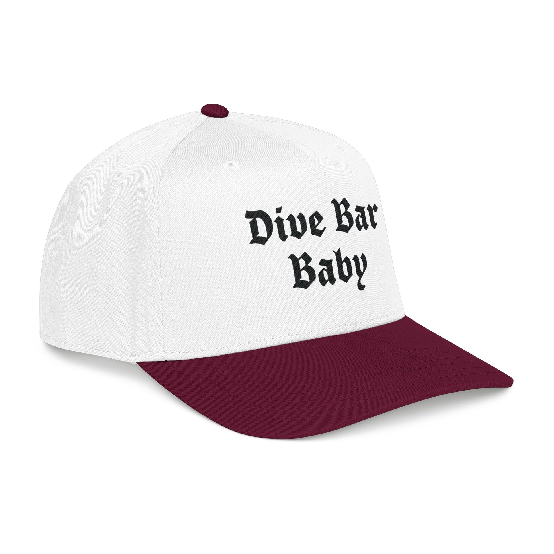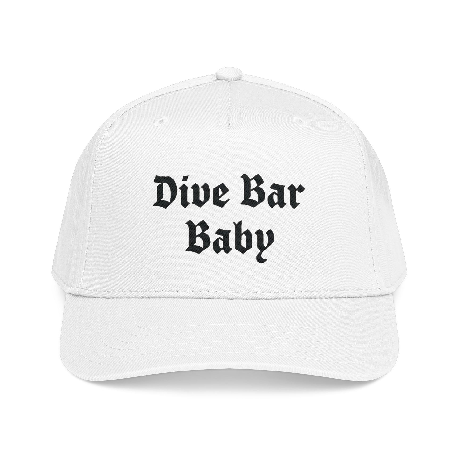 Soft, lived-in attitude in a tidy silhouette. This mid-profile baseball cap carries bold, vintage-style lettering that reads "Dive Bar Baby," giving it a low-key, rebellious voice without shouting. The structured five-panel shape and seamless front panel keep the embroidery crisp and centered, while the matched undervisor and sweatband maintain a clean, finished look.