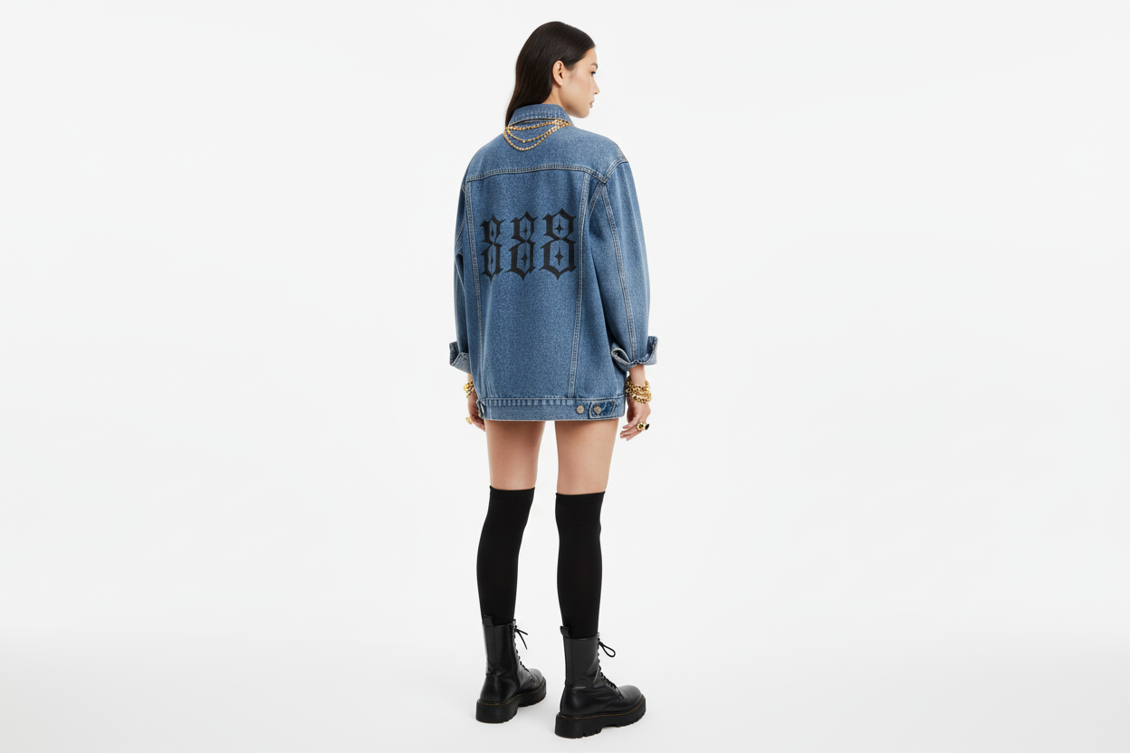 A lived-in denim jacket with vintage lines and modern attitude. The relaxed silhouette drapes over tees and hoodies, while sturdy metal buttons and classic flap chest pockets keep the look honest and functional. The light-blue wash shows subtle fading and contrast stitching that age beautifully with wear. On the back, a bold, gothic-style numeric motif adds a streetwise edge — something a rider or downtown wanderer would reach for on crisp mornings. Wear it to late-night coffee runs, open-air markets, or when you want an easy layer that reads confident without trying too hard.