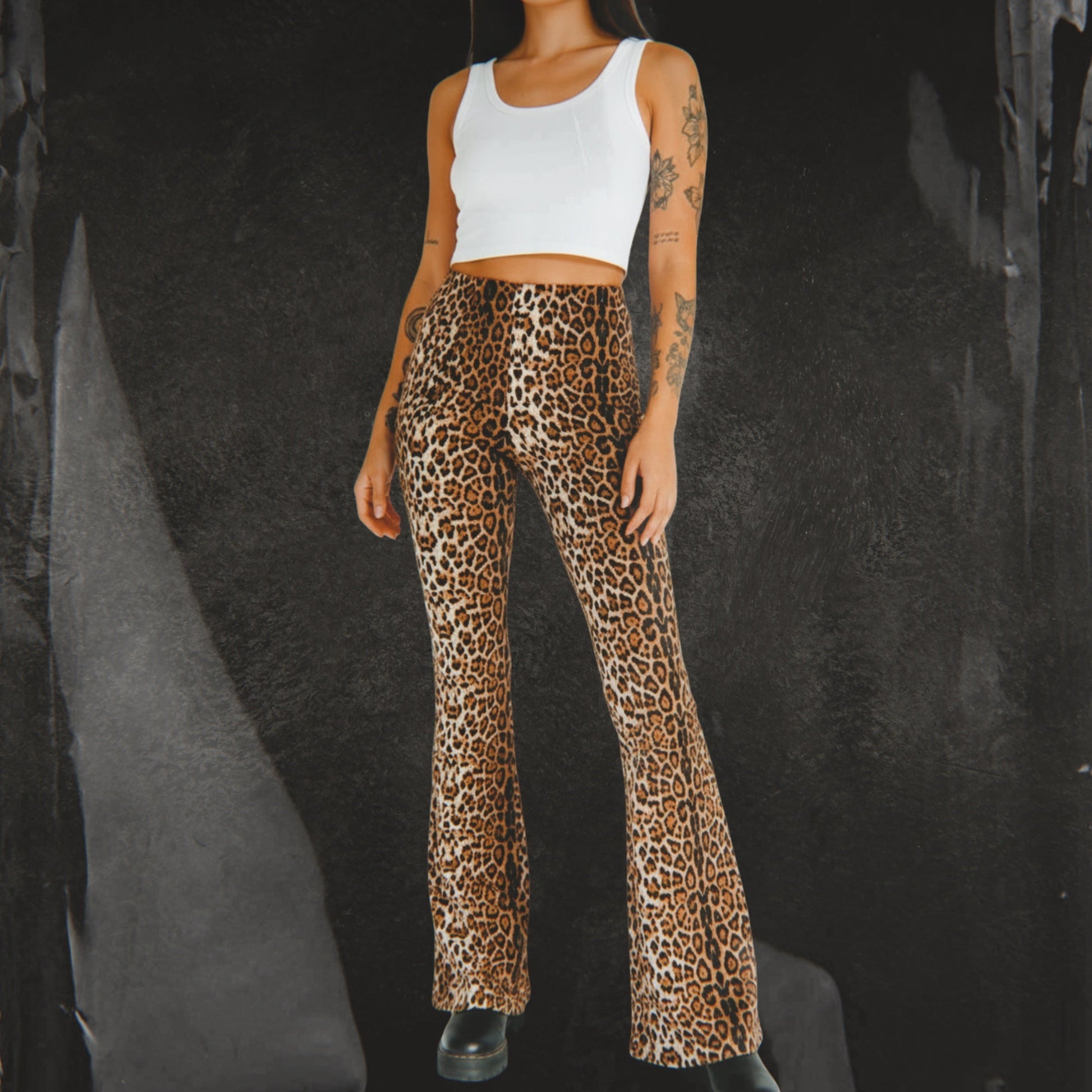 These flares are the ultimate statement piece. Style them with a fitted black turtleneck and platform boots for a '70s-inspired look, or keep it casual with a graphic tee and sneakers. The leopard print adds instant edge, while the flare leg creates a balanced, flattering silhouette. Perfect for those who want to stand out without trying too hard.